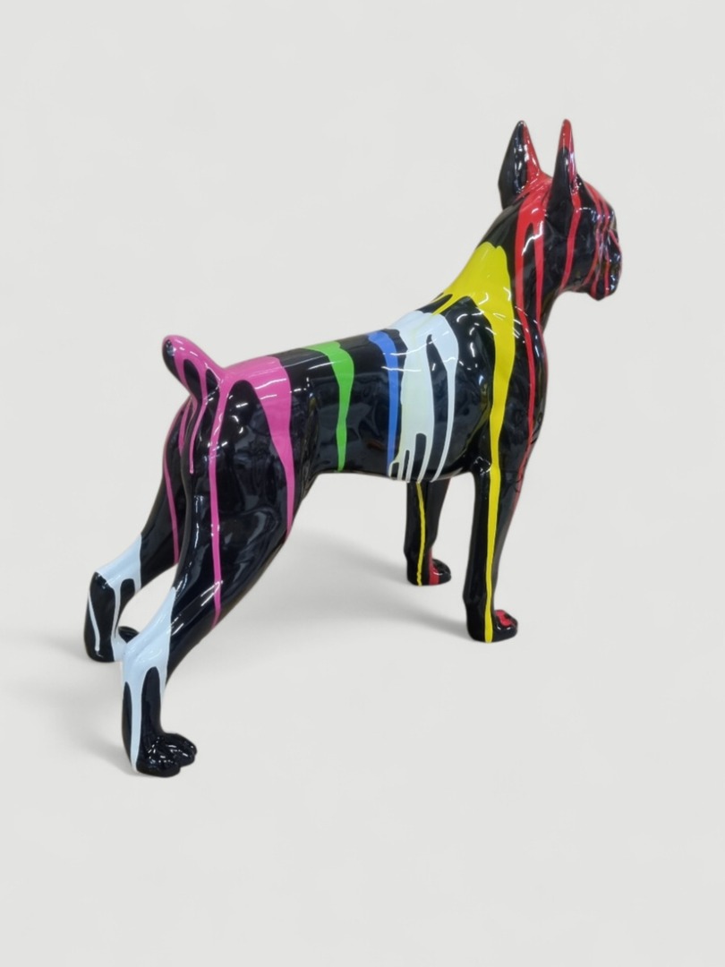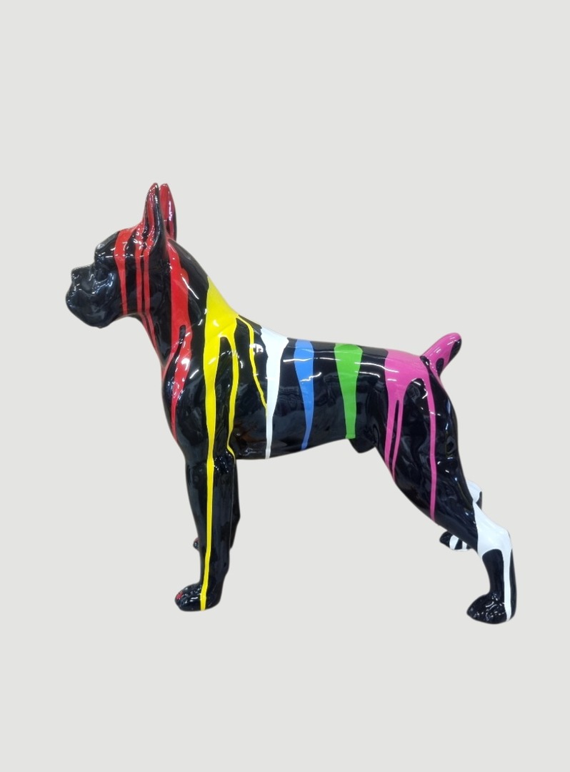 Diese bunte Deko Figur Boxer-Hund mit einer Größe von 55 cm ist ein farbenfrohes und modernes Dekorationsstück, das die charakteristischen Merkmale der Hunderasse auf kunstvolle Weise interpretiert.