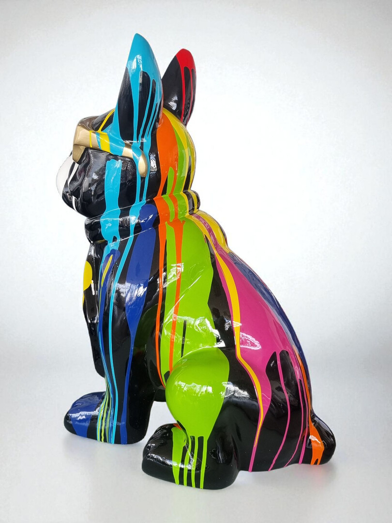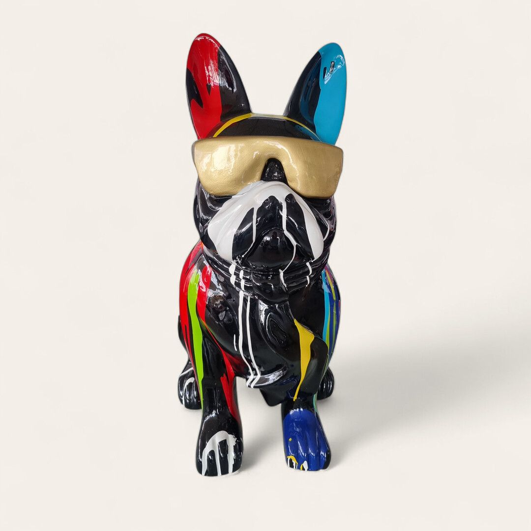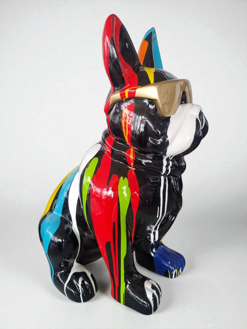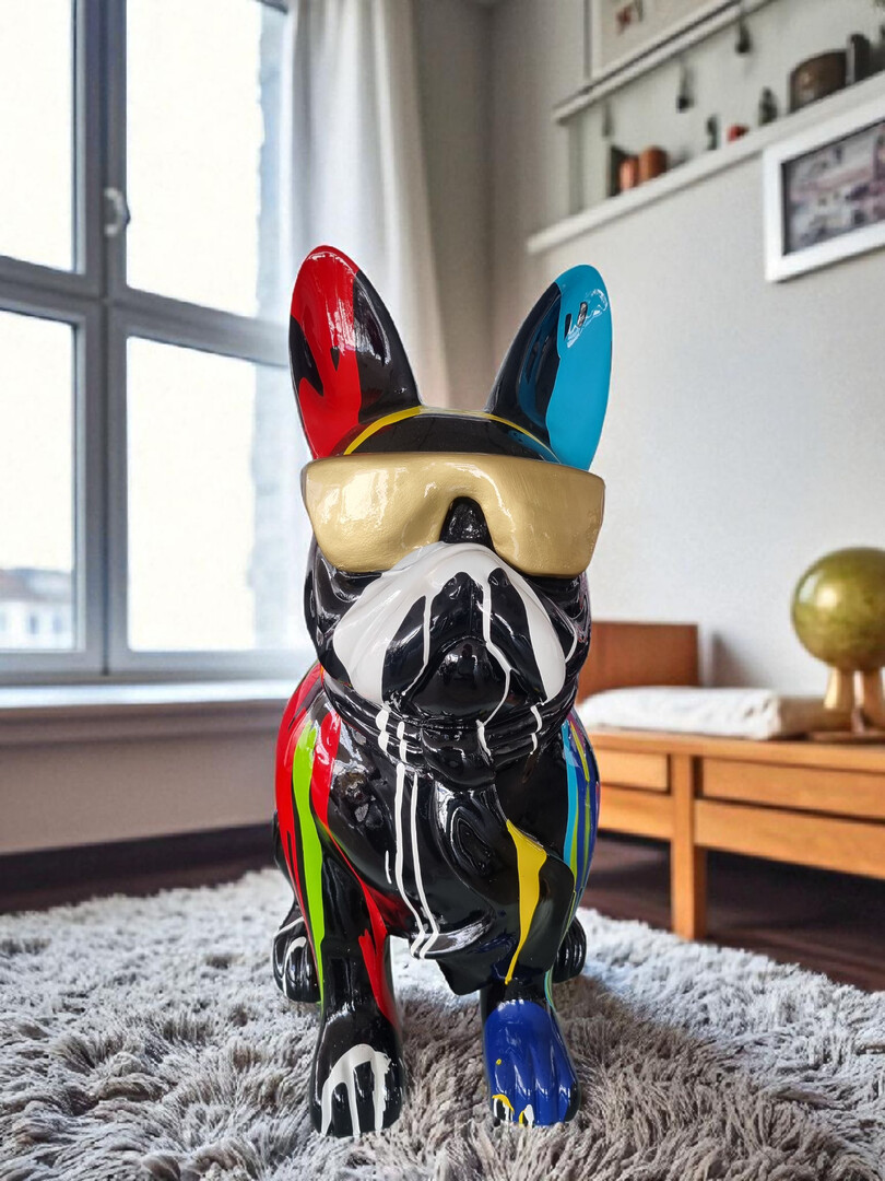 Verleihen Sie Ihrem Wohnzimmer, Ladenlokal oder Garten mit unserer bunt bemalten französischen Bulldogge mit Brille einen einzigartigen Charme. Diese exklusive Gartenfigur ist ein wahrer Blickfang und zieht alle Blicke auf sich.